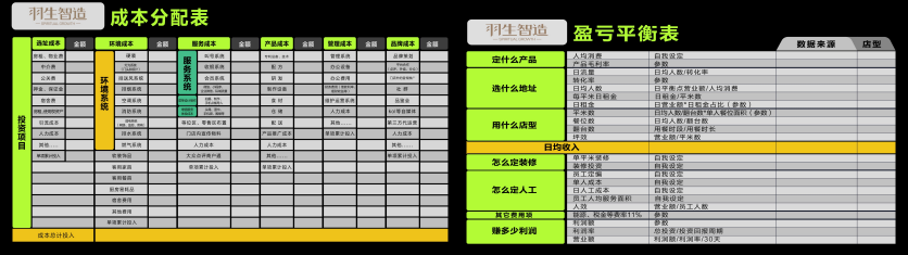 而在实操中对以上内容进行延申,可将其落地为投资回报表、盈亏平衡表和成本分配表,通过这3个表格在前期对品牌目标进行预设,并对门店经营给出有效指导。