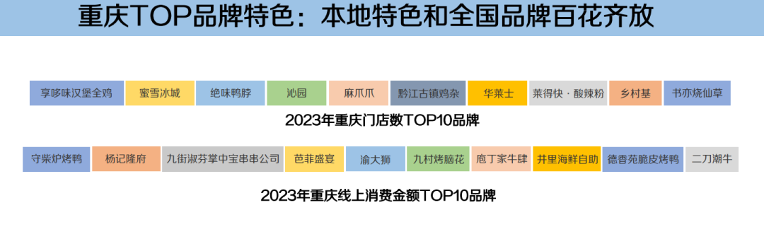 从2023年重庆门店数TOP10品牌中也可以略窥一二:享够味汉堡全鸡、蜜雪冰城和绝味鸭脖位列前三。2023年重庆线上消费金额TOP10品牌上榜品牌中,渝大狮,庖丁家牛肆等本地品牌榜上有名,北京菜守柴炉烤鸭则位列榜首。