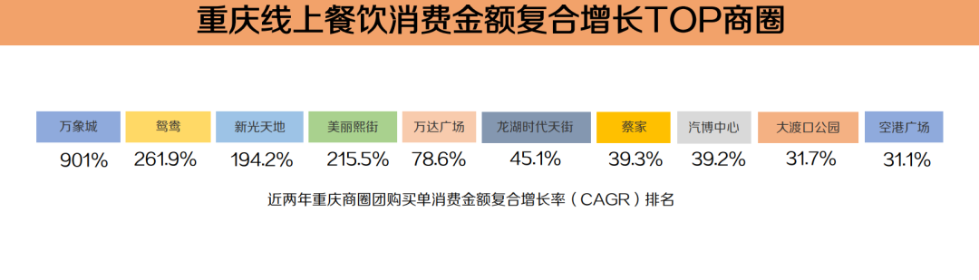商圈的数据表现能够帮助对标品牌发展的增量空间,同时对于子品牌或新店选址有一定的参考意义。通过对近两年团购买单消费金额复合增长率(CAGR)进行统计,表现最好的重庆商圈包括万象城、鸳鸯、新光天地等。
