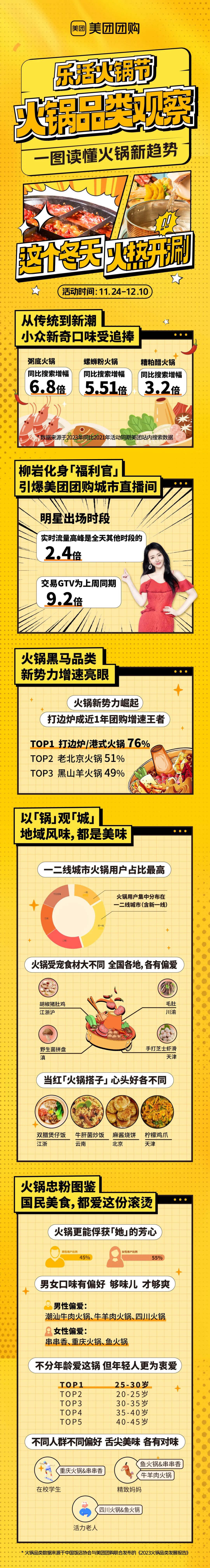 这个冬天,火热开涮!11月24日-12月10日,美团团购联动福利官柳岩,开启“美团团购乐活火锅节”。活动期间,火锅团购专属福利大放送:站内曝光亿级强势曝光、最高100元火锅红包补贴助力转化;8城联动打造专场直播,福利官柳岩现身成都直播间狂撒福利,1元火锅霸王餐、9.9元爆品火锅团购限量抢;商圈地推补贴加持,在到店消费“最后一公里”精准获客。多重流量、资源、玩法强势加持,助力火锅商家商家实现品牌曝光和销量增长。快来感受一下乐活火锅节背后的趋势洞察吧!👇• 一文get美团团购双旦生意趋势热点!• 号外!美团团购双旦生意启示录人群趋势篇强势来袭!• “心价比”时代,烘焙玩家“攻心”四大策略关注“新餐饮洞察”解锁更多精彩内容