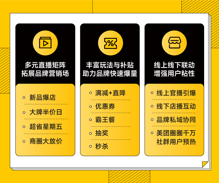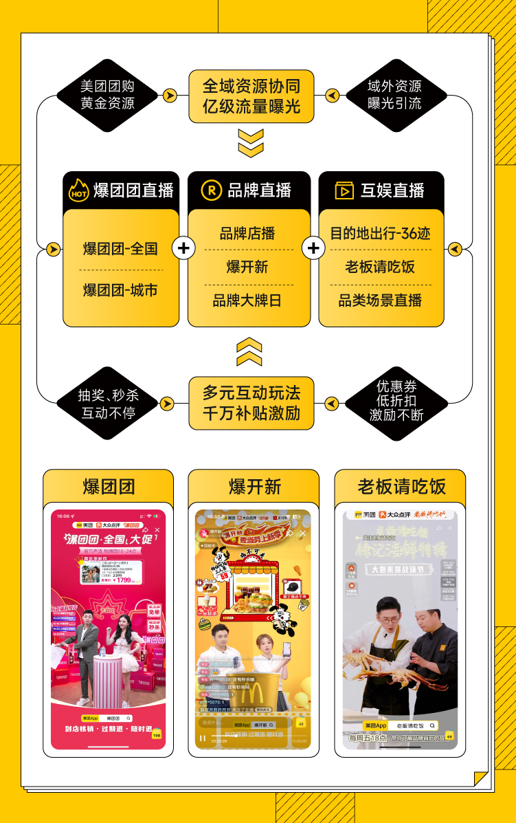 美团直播是覆盖吃喝玩乐全领域的直播矩阵。日播、周促、月促全时段流量覆盖、高频次渗透;品牌与官播多端强强联合,联动100+城市商家,整合亿级资源曝光;福利好礼送不停,助力商家拓展新场域的同时积累新用户,获得生意新增量。商家零成本顶级直播流量助力品牌爆单增长目前,美团直播不需商户额外购买流量、不需商业化投流,而且美团提供专业官方直播运营团队,入场门槛低,为商家节省营销人员成本,短期可快速助力生意增长。双旦海量曝光打造节日直播盛宴助力商家快速爆单双旦期间,美团团购直播通过打造多场主题直播、强势资源曝光和创新玩法,为团购商户打造节日直播盛宴。热门主题活动打造城市官播精准触达本地用户结合当地城市特色和热门趋势,通过【大牌半价日】、【超省星期五】、【商圈大放价】等直播主题,与当地城市消费者进行深度链接。强势资源曝光高效引流转化双旦期间平台将投入亿级曝光资源、千万补贴,首页直播广场、猜喜直播卡、游戏任务、搜索资源包、营销push等全力加持,一键直达。创新玩法叠层提升节日氛围助力品牌快速渗透新客双旦期间直播主题/福利/创意层出不穷,新品爆店、大牌半价日、超省星期五、商圈大放价等多场直播轮番上阵,更有圣诞、跨年专场带领用户一起嗨。还有丰富玩法全方位助力商家突围节日大促,优惠券、霸王餐送不停,还有多轮抽奖让用户根本停不下来,商圈里直播,一整天不停播!线下直播间与用户亲密互动,还有趣味横生的引爆活动点燃城市。人货场高效协同实现双旦生意脉冲式增长美团直播具备独特逻辑与优势,这也决定了美团直播间具备打造超级爆品的能力。商家参与并做好团购直播,其核心关键因素是需要基于“人、货、场”的模式打开思路,制定人货场融合策略:三层爆品组货策略打造“阳光超级爆品”通过货品组合与搭配各司其职,提升在双旦期间的优惠价格突出且提供专属供给。如【超级爆品+秒杀福利品+引流品】组合累计5-10款货品,以20元以下低价商品为主可供秒杀,尽量选日常常用认知度高的单品。·超级爆品:聚焦主推单品、更高折扣力度、高渗透率、覆盖广、应季单品·秒杀福利品:主打低价、深折、限时限量抢·引流品:作用是吸引流量/优惠明显/知名度高,直播前20分钟热场出现分层式多场次直播扩大规模实现生意脉冲式增长【月度大场+人群场景+内容专场】相结合,让品牌传播更立体,让用户触达更丰富;大规模、多场次、深耕内容与场景的组合更有效促进品牌的转化、实现生意持续增长。多渠道精准触达提升品牌人群量级双旦期间,美团官方为团购官播的品牌和爆品提供优势流量等资源加持,参与双旦活动的商家/品牌需与官播做好内外呼应, 外部通过品牌私域阵地进行宣导,站内做好资源和直播承接,通过矩阵式营销做好前置预热,实现品牌公私域资源联动,进而加速上线下流量互通互融和转化,将更多的线下用户引流到线上,给用户全方位的节日氛围营造,助攻全民消费。美团直播助力品牌新客获客能力案例一:某餐饮品牌新品发布周期内,通过美团直播间做品牌新品发布。分别通过品牌私域预热、站外种草合作、线上线下互动结合,最终官方直播间销量引爆。带动品牌新品GTV提升超136%。案例二:某茶咖类品牌,通过官播矩阵的布局、月度大场的引爆,推动品牌单日50%增量销量额的提升。同时品牌渗透也有效提升,官播大场的精准用户画像、推动了品牌生意在未来周期内持续获得更多优质用户流量的推荐,保持了生意的持久、稳定的高增长态势。• 一文get美团团购双旦生意趋势热点!• 号外!美团团购双旦生意启示录人群趋势篇强势来袭!• “心价比”时代,烘焙玩家“攻心”四大策略关注“新餐饮洞察”解锁更多精彩内容