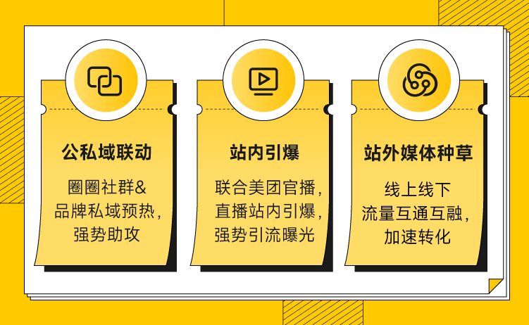 双旦期间,美团官方为团购官播的品牌和爆品提供优势流量等资源加持,参与双旦活动的商家/品牌需与官播做好内外呼应, 外部通过品牌私域阵地进行宣导,站内做好资源和直播承接,通过矩阵式营销做好前置预热,实现品牌公私域资源联动,进而加速上线下流量互通互融和转化,将更多的线下用户引流到线上,给用户全方位的节日氛围营造,助攻全民消费。