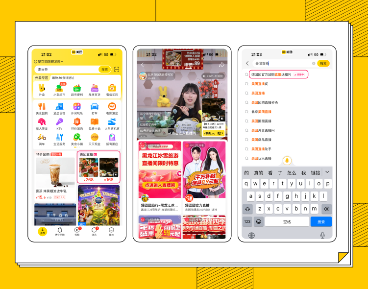 美团直播是覆盖吃喝玩乐全领域的直播矩阵。日播、周促、月促全时段流量覆盖、高频次渗透;品牌与官播多端强强联合,联动100+城市商家,整合亿级资源曝光;福利好礼送不停,助力商家拓展新场域的同时积累新用户,获得生意新增量。